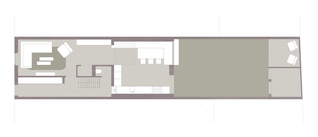 Deze stadswoning voor een gezin van vier onderging een grondige herorganisatie van de functies. De badkamer werd verplaatst van het gelijkvloers naar de eerste verdieping, waardoor op het gelijkvloers de bestaande aanbouw kon worden vervangen door een nieuwe, ruime leefkeuken.