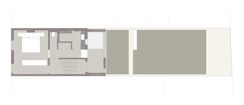 Het dak op de eerste verdieping werd in twee richtingen opgetild om rekening te houden met de bestaande randvoorwaarden. Deze atypische vorm onderlijnt het architecturale karakter van de woning en laat toe een maximale hoogte voor de vide te realiseren, zonder de bestaande raamopeningen op de tweede verdieping te verstoren.