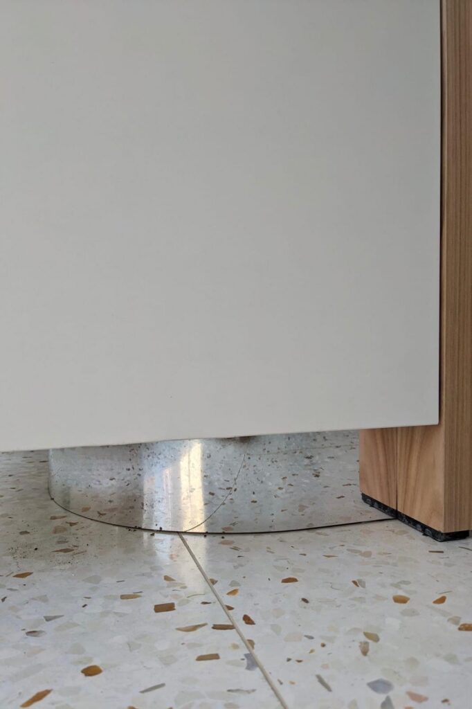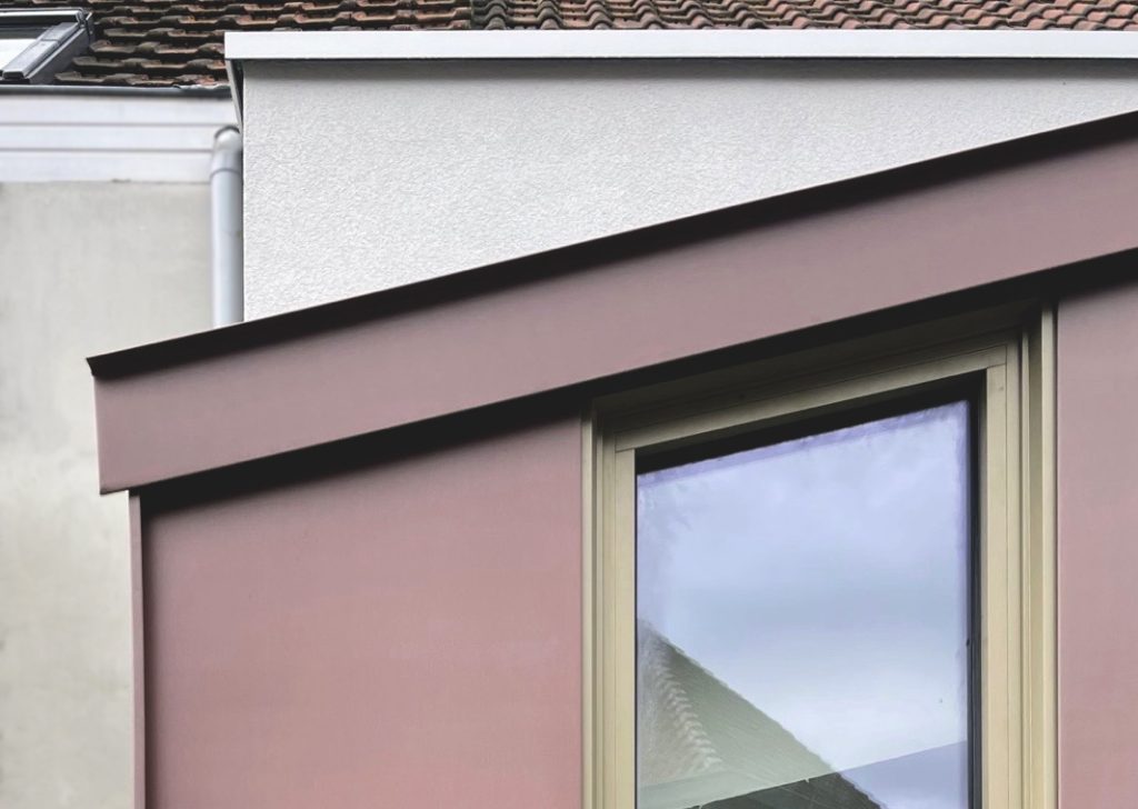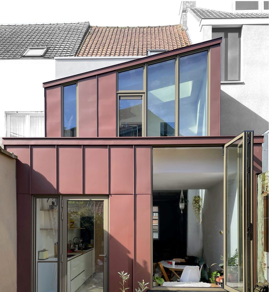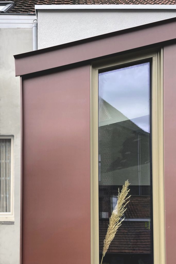 Het project dankt zijn kracht aan een reeks duidelijke en weloverwogen ingrepen en verfijnde detaillering. Het slank uitgewerkte dakprofiel, de gevel in rood zink, de messing handgrepen en een maatmeubel waarin de dampkap discreet werd geïntegreerd, geven de woning een hedendaags en speels karakter. Ook de badkamer kreeg op een beperkte oppervlakte precies wat nodig was: een grote inloopdouche met zitbank, uitgevoerd in mortex wat rust en een uitgesproken gevoel van ontspanning in de woning brengt.