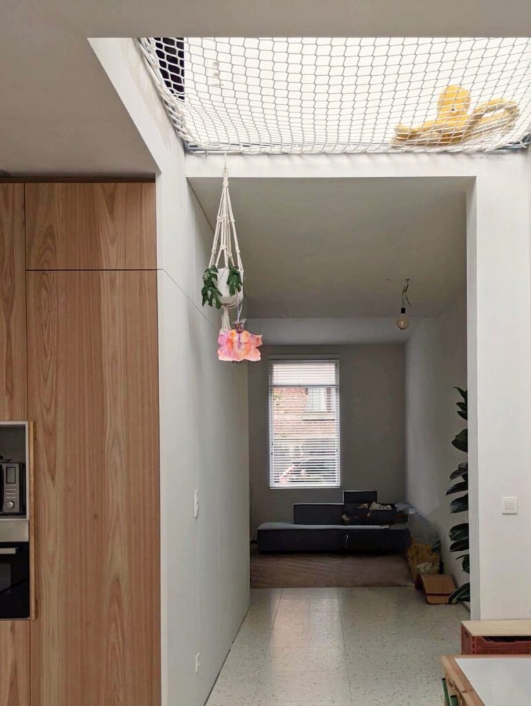 Op de eerste verdieping werd maximaal uitgebreid binnen de toegelaten twee meter, wat plaats bood aan een werkplek, hobbyruimte én een hangmat. Die hangmat werd centraal in een dubbele hoogte opgehangen, waardoor zowel het gelijkvloers als de verdieping een uitgesproken ruimtelijk gevoel krijgen en daglicht diep in de woning kan doordringen.